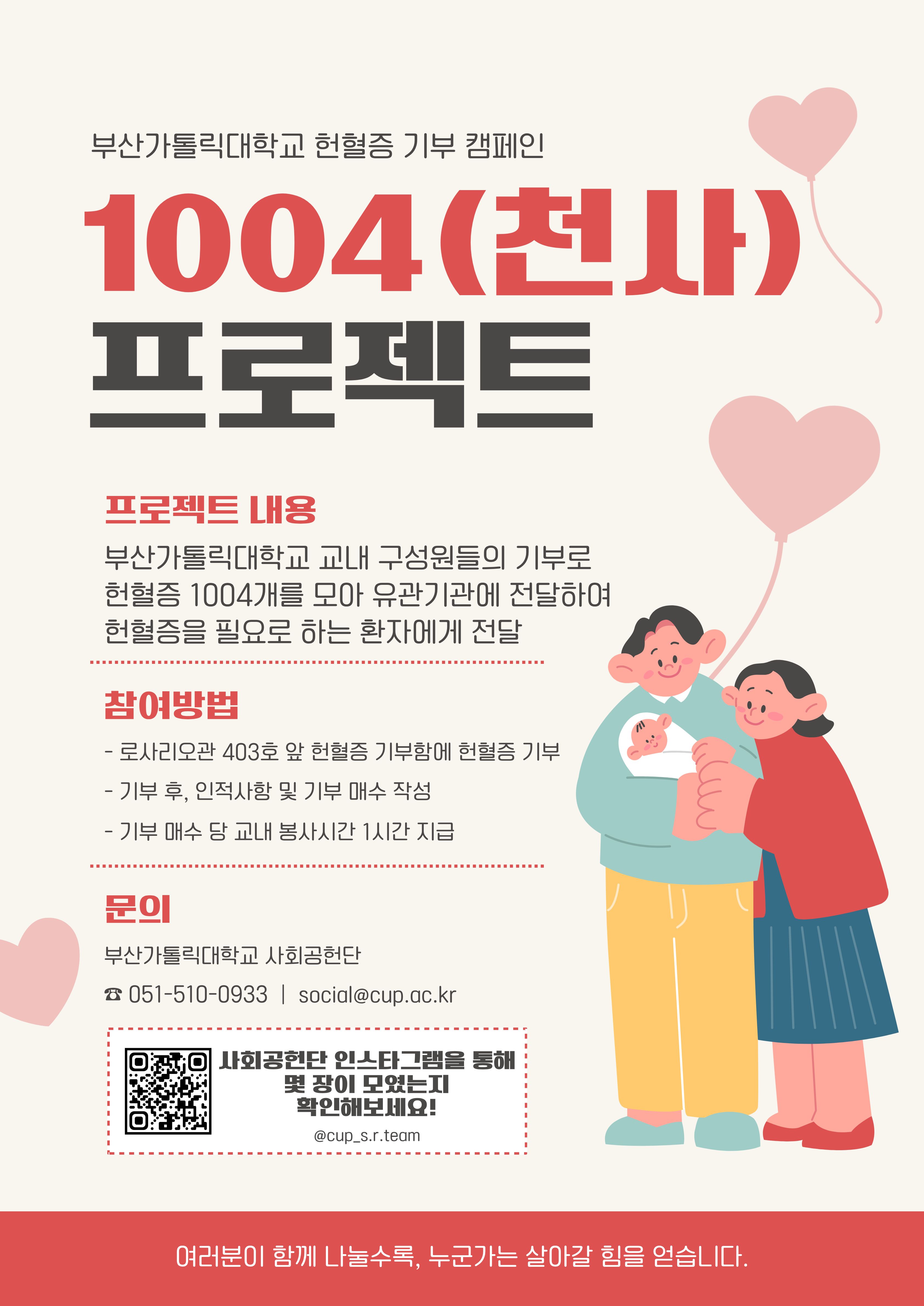사회공헌단에서는 혈액과 관련된 질병을 앓고 있는 환자들의 어려움에 공감하며, '생명사랑'과 '인간존중'을 실천하기 위해 헌혈증 기부 캠페인을 실시하오니 교내 구성원분들의 많은 관심과 참여 부탁드립니다.